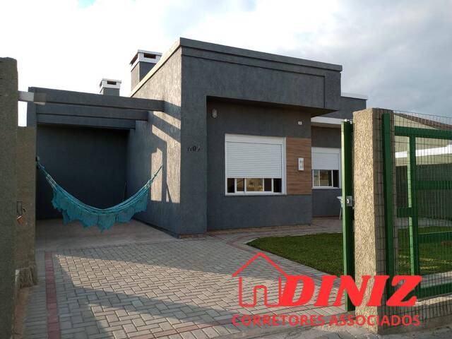 Vendo casa 2 dormitórios, suíte, banheiro social, cozinha e sala interligadas, lavanderia, vaga para 2 carros, pátio na frente e fundos, 97 m2, terreno de 300 m2, na Av. Cananéia em Atlântida Sul, Osório. Mobiliada com churrasqueira na parte interna, lareira, piso frio.